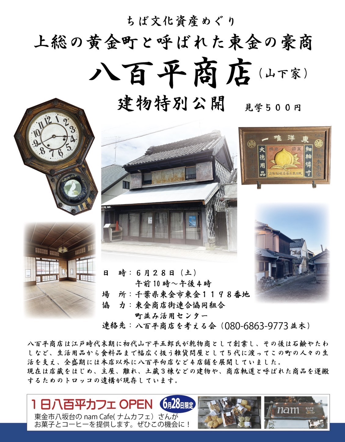 ちば文化資産巡りに際して、開催当日28日に東金駅西口歴史建造物群としてスタンプラリーの1カ所である八百平商店の特別一般公開が行われます。 上総の黄金町と呼ばれた往時の東金の姿を今に残す貴重な場所なのでぜひこの機会に!