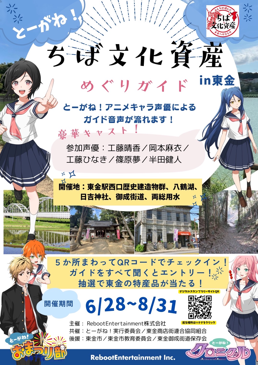 東金市に点在する5つの「ちば文化資産」を、声優による録りおろし音声ガイドとともに巡る、期間限定の周遊イベントを開催します。伝統と自然が息づく東金のまちを、耳と心で味わう新たな体験です。 今回のイベントでは、東金駅西口・八鶴湖・日吉神社・御成街道・両総用水の5カ所を舞台に、それぞれの魅力を語るキャラクターによる音声ガイドをスマートフォンで楽しめます。ガイド音声はすべて本イベントのための新規録りおろしで、豪華声優陣による臨場感あふれるナビゲーションが聴きどころです。